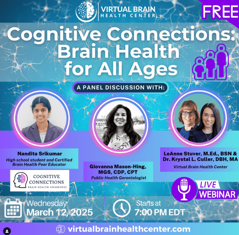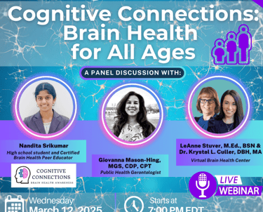 On Mar 12th, 2025, had an amazing opportunity provided by Virtual Brain Health to be part of the Brain Awareness Week Live webinar. Cognitive Connect had an hour long event on "Brain Health for All Ages". The primary objective is to raise awareness, build support, and take practical steps to enhance brain health at every stage of life among the listeners.